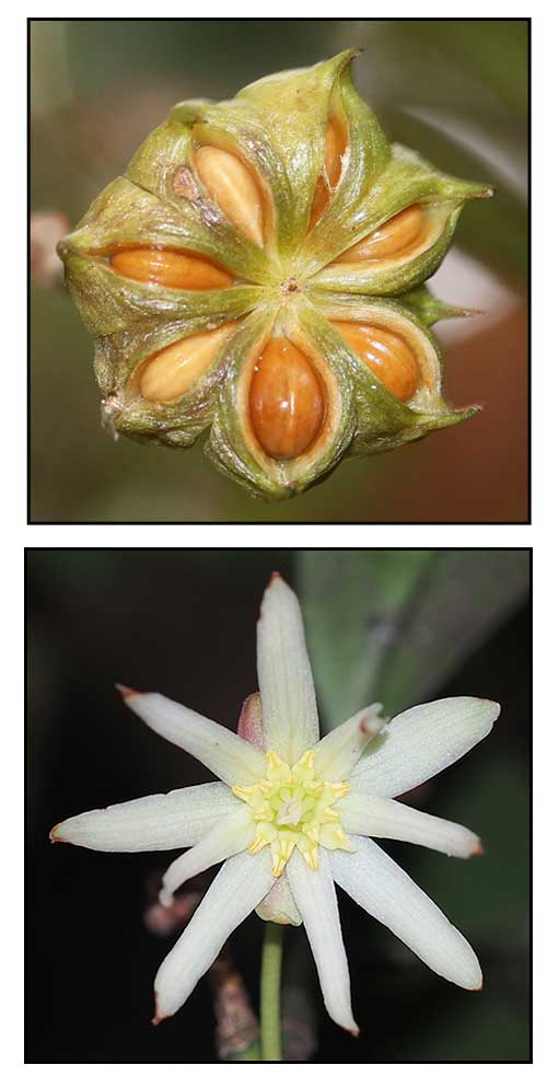 • Sanke is an evergreen shrub or small tree growing up to 8 meters high. Leaves are alternate, simple, narrowly ovate or lanced-shaped, 4 to 12 centimeters long, 1.5 to 5 centimeters wide, wedged-shaped at the base, tapering, and blunt at the apex. Flowers are axillary, usually crowded, sometimes solitary, with 12 to 15 perianth lobes, spirally arranged, 3 millimeters wide, pale yellow to white. Carpels are 7 to 9, arranged in a single row or close circle. Fruit is a capsule-like follicetum, 2.5 centimeters in diameter, with an aggregate of 7 to 8 follicles arranged around a central star-shaped axis. Each follicle is boat-shaped and 1-seeded.