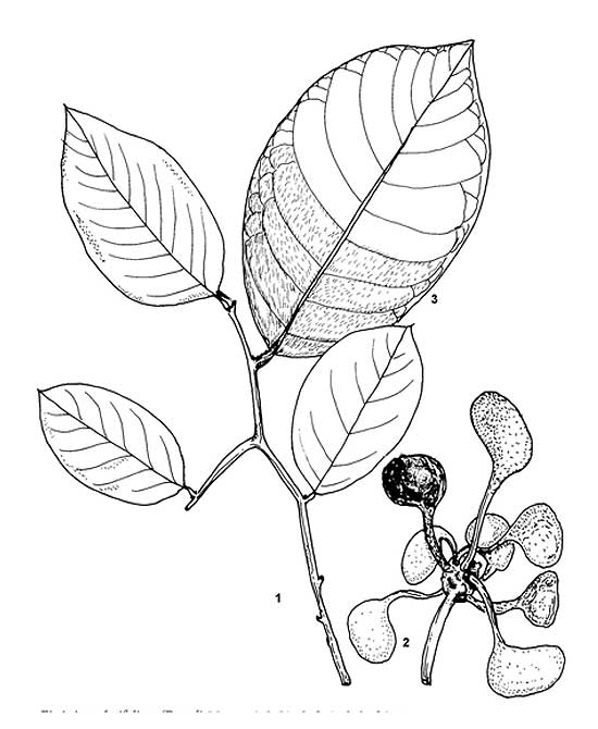 • A large liana can grow up to measure 20 m long. Leaves are oblong, obovate or oblong-lance-shaped and with a size of measuring 8-35 cm x 3.5-15 cm. The rusty brown hairy leaves are with distinct tertiary venation below. The outer orange petals are measure 1-3 cm long. Monocarp is oblong or nearly spherical in shape, measuring about 2-5 cm long and with stalk that up to measure 4 cm long.
