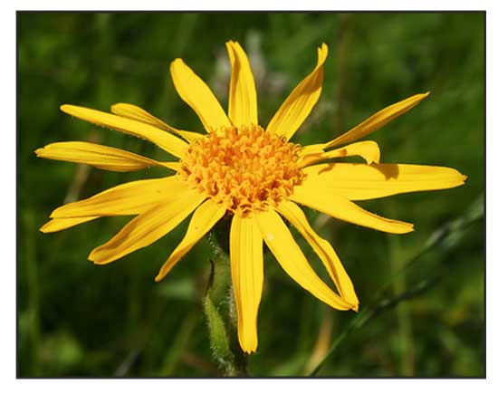 • Arnica is a perennial plant growing to a height of 20 to 60 centimeters. Stems are round, slightly hairy, 20 to 60 centimeters, usually supporting a single flower head. Leaves are bright green, oblong-ovate, short-petioled, most in a basal rosette. The upper ones are smaller and sessile, toothed and slightly hairy, while the lower leaves have rounded tips. Flower heads are 8 to 9, large and daisy-like, yellow-orange, about 5 centimeters in diameter. Fruit is brownish, with a single row of white barbed hair.