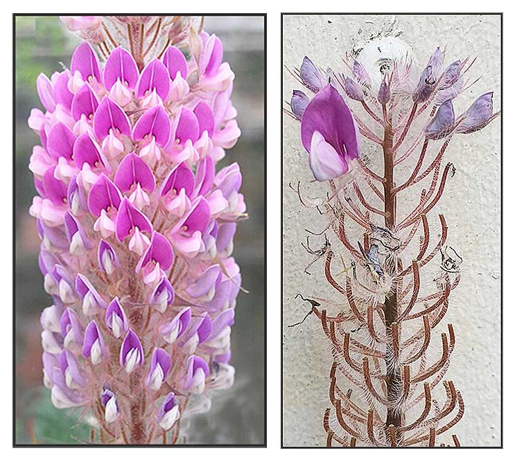 • Erect subshrub, 0.5-2 m tall. Branches terete, densely pubescent. Leaves pinnately compound, upper leaves 3-7-foliolate, lower ones 3-foliolate; petiole 10-13 cm long, pubescent; stipules free, about 1 cm long; stipels 3 mm long; leaflets ovate to lanceolate, 8-16 cm × 1.5-5.5 cm, apex acute, glabrous above, hairy beneath. Inflorescence a terminal, cylindrical, densely flowered raceme, (7-)12-30(-50) cm long; lower bracts empty, upper ones with 2 flowers, lanceolate, 10-20 mm × 3-6 mm; pedicel 3-15 mm long; with long bristles.Calyx tube short, 2 upper teeth up to 6 mm long, 3 lower teeth up to 7 mm long; corolla purplish pink; standard obovate, 6-10 mm × 6-8 mm, glabrous; wings shorter than keel, clawed; keel 7-9 mm long, clawed; stamens 10, diadelphous.Pod 2-4(-7)-jointed, constricted between joints, indehiscent, shiny black, hairy. Seed reniform-globose, compressed, 1.5-2 mm in diameter, brown. (PROSEA)