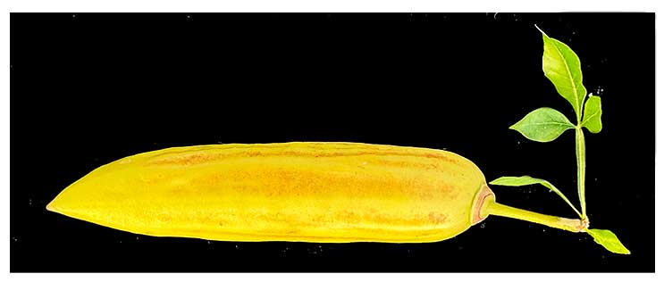 Tree grows up to 6 m tall. The leaves are arranged oppositely, each made up of three leaflets. They are borne on winged petioles up to 5 cm long. Flower is solitary or borne in a cluster of up to four. The five-lobed corolla is greenish white. Fruit is a taper-shaped berry up to 60 cm long, fleshy and edible, green, ripening yellow, and waxy in texture. Record length is 120 cm long while only 2.5 cm wide. (2)