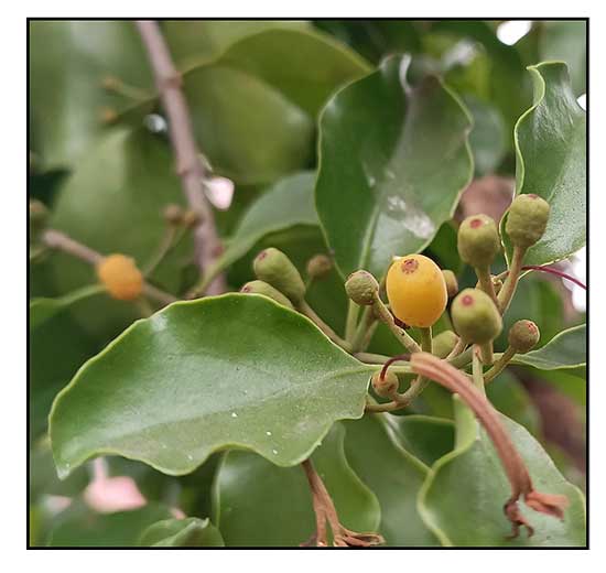 • Growth form: Parasitic shrub, able to grow up to 0.5 - 1 m in length. Foliage: Opposite green leaves, ovate to ovate-oblong, measuring about 2.5 - 6 by 1.5 - 4 cm, both surfaces becoming smooth as leaves mature, leaf margins reddish brown, leaf stalk measuring about 8 - 10 mm long. Flowers: Tubular, curved flowers, usually 2 - 4 in an umbel, peduncle measuring about 2 - 4 mm, stellate hairy, bracts triangular in shape, pedicel measuring about 6 - 7 mm, ovoid calyx, style red in colour. Fruit: Ellipsoid berry yellow in colour, measuring about 8 - 10 by 5 - 6 mm, surface becoming smooth as fruit matures. (Flora & Fauna Web)