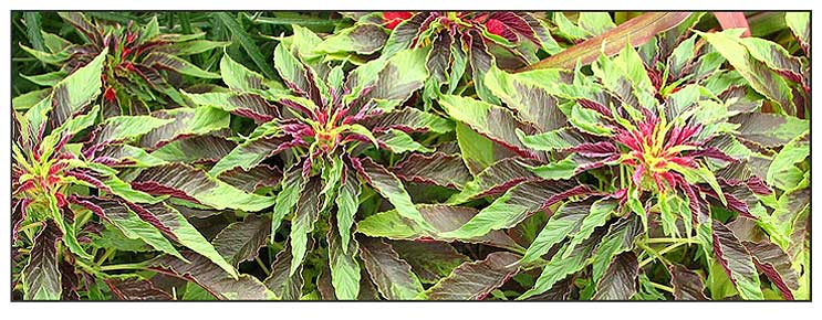 • Plants annual, glabrous. Stems erect, often branched, 0.8-1.5 m. Leaves: petiole 1/2 as long as blade; blade ovate, elliptic, rhombic, or lanceolate, mostly 4-12 to 1.4-6 cm, base tapering, margins entire, usually undulate, apex acuminate and short-mucronate; distal leaf blades green, red, scarlet, maroon, purple, yellow, and cream (unique to A. tricolor) . Inflorescences axillary glomerules. Bracts of pistillate flowers ovate to lanceolate, 5-6 mm. Pistillate flowers: Tepals 3, narrowly ovate to lanceolate, 5-6 mm, apex aristate; style branches spreading; stigmas 2-3. Staminate flowers intermixed with pistillate; tepals 3; stamens 3. Utriclesovoid, 2-2.5 mm, rugose, dehiscence regularly circumscissils. Seeds: black or brownish black, subglobose, 1 mm diameter, shiny. (Flora of North America)