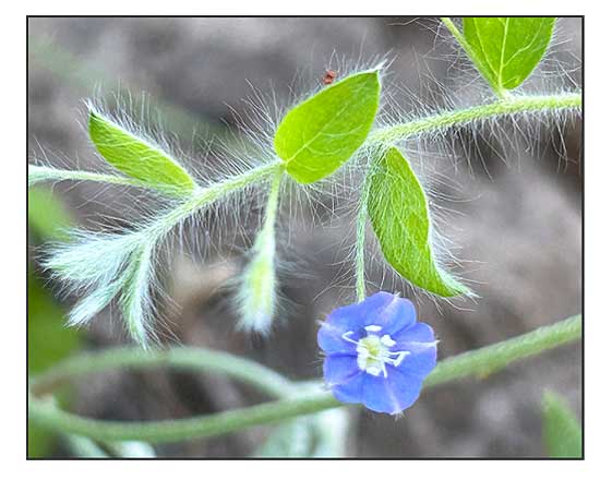 • E. alsinoides is a herbaceous plant, annual or perennial with numerous prostrate or ascending stems, slender, with appressed and spreading hairs. Leaves are petiolate or subsessile, 0.7 to 2.5 cm long and 5 to 10 mm long. Flowers are isolated or grouped in pauciflorous cymes, borne by filiform peduncles, 2.5 to 3.5 cm long. Calyx is formed by villous, lanceolate sepals 3 to 4 mm long. Corolla is rounded, with pentameric symmetry, blue in color, rarely white, 7 to 10 mm in diameter. Stamens with filiform filaments  are united at the base of the corolla tube. Ovary is glabrous, surmounted by two free styles. Fruit is a globular capsule, with four valves, generally containing four seeds that are black and smooth. (24)