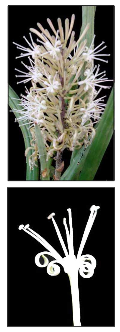 • Growth form: Rhizomatous succulent with rod-like leaves that alternate to form a fan-like shape, growing up to 0.9 - 1.2 m tall and 0.6 - 0.9 m wide. Foliage: Stiff, cylindrical leaves taper to a sharp point and have a ribbed surface (0.6 - 1.5 m long, 2 - 3 cm wide). Leaves are greyish green with indistinct dark green bands that create a striped pattern. Flowers: White, fragrant flowers are tubular with 5 linear lobes curled backwards (2.5 cm long). The long, white stamens extend well beyond the lobes. Flowers are arranged in a whorled pattern along a spike-like inflorescence that is actually a raceme. (Flora & Fauna Web)