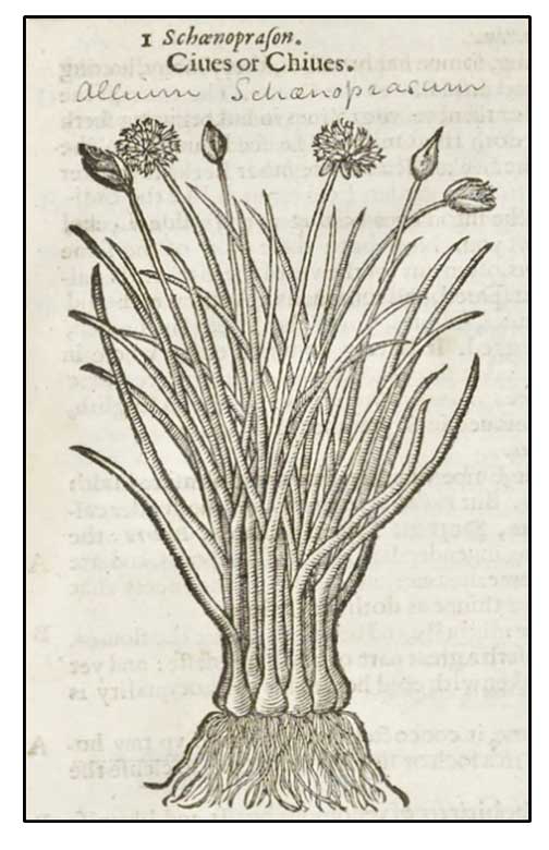 - Etymology: The species name schoenoprasum derives from Greek words skhoinos (sedge or rush) and prason (leek). The English name, chives, derives from the French word cive, from cepa, the Latin word for onion. (2)