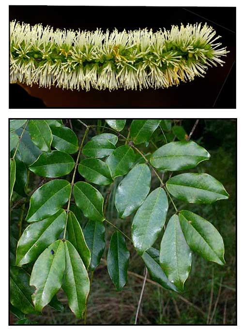 • Climbers, woody. Pinnae 2 pairs, 5-15 cm; leaflets 3 or 4(or 5) pairs per pinna, opposite, obovate to elliptic-lanceolate, unequally sided, 2.3-7 × 1.3-3.5 cm, papery, abaxially glaucous, base rounded to broadly cuneate, apex acuminate to obtuse, or emarginate. Spikes solitary or fasciculate, axillary, 12-25 cm. Flowers male or bisexual. Calyx green, cup-shaped, 0.8-1 mm. Petals white, narrowly elliptic to lanceolate, 2.8-3 mm. Stamens white, turning yellow, 5-6.5 mm. Ovary glabrous. Legume straight to slightly curved, to 2 m × 7-15 cm; segments 6.5-7.5 cm, epicarp and endocarp woody. Seeds brown, brilliant, suborbicular, flat, 3.5-4 × ca. 1 cm. (Flora of China)