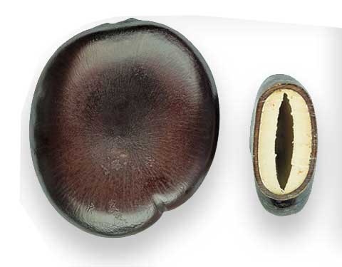 the seeds. Seeds are hard, and circular, with their sides flattened, about 5 centimeters across, and chocolate brown.