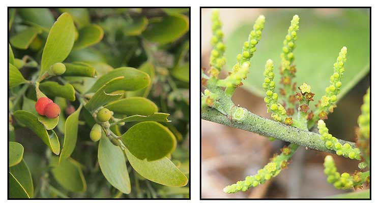 • A small tree (or large shrub) growing to 10 meters tall, hemiparasitic on the roots of other trees. Leaves are approximately as broad as long, around 4 cm long. Flowers are produced in slender spikes mostly approximately 1 cm long. Fruit is a globular nut on a short stalk. As it ripens the stalk swells and turns red, like an inside out cherry. The fruit is 4–6 mm long and is inedible. (4)