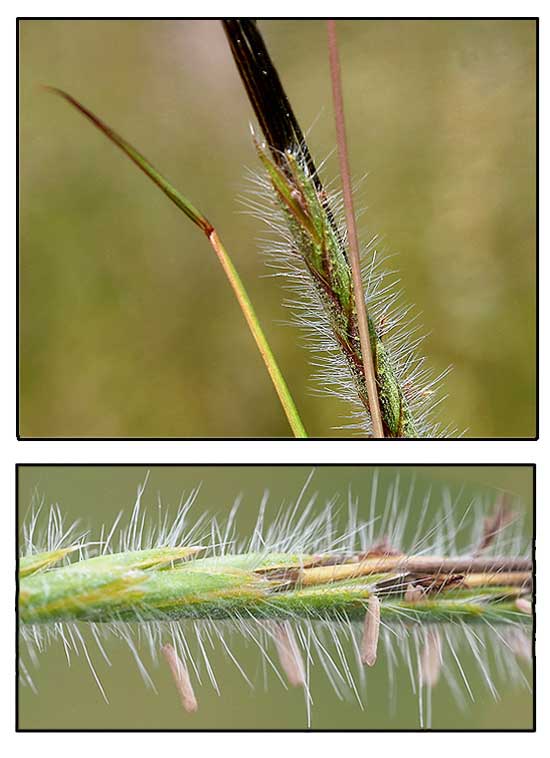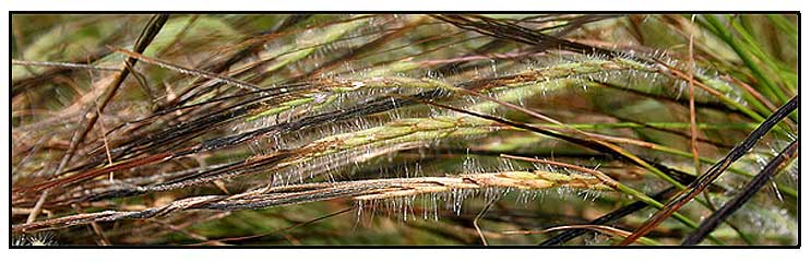 • Perennial. Culms slender, tufted, usually geniculate at base, 20–100 cm tall. Leaf sheaths keeled; leaf blades flat or folded, 10–20 × 0.3–0.6 cm, scabrid or adaxial surface pilose at base, apex obtuse or shortly acute to apiculate; ligule ciliate along margin. Inflorescence terminal or racemes gathered into a scanty panicle; spatheoles linear, tightly rolled around peduncle; peduncles mostly long-exserted. Racemes 3–7 cm (excluding awns), narrowly cylindrical, 7–12-awned, (1–)3–10(–12) pairs of flat green homogamous spikelets below the awned fertile pairs. Sessile spikelet 5–7 mm, dark brown; callus 2–3 mm, fiercely pungent, brown bearded; lower glume linear becoming cylindrical at maturity, sometimes hispidulous between veins; awn 6–10 cm, dark brown, column white-hirtellous, tips of successive awns often twisting together. Pedicelled spikelet 6–11 mm, lower glume oblong-lanceolate, greenish, laterally asymmetrically winged, glabrous or sparsely to densely pilose or tuberculate-hispid or white setose. (Flora of China)