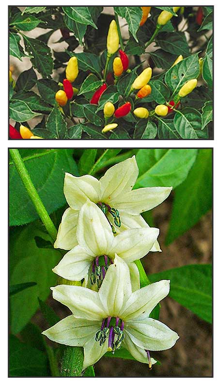 • Growth form: A shrubby plant. Roots:The plant is supported by a short to long taproot with many spreading lateral roots and fibrous roots. Stems: Stem of mature plants are woody but moderately soft and weak. Older branches are light gray. Flowers: Greenish-white with blue or yellow anthers occur in groups of two or more at the nodes. The common features of frutescens cultivars are their greenish flowers and their steeply upwards direction pedicles; also the small and pointed fruits keep their upright position until maturity. Fruit: Berries are red when mature, tapered. (Flora & Fauna Web)