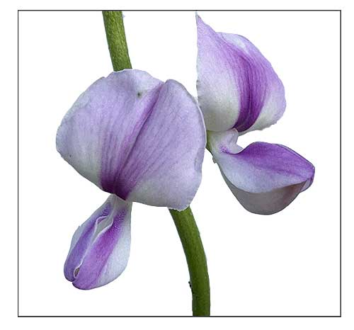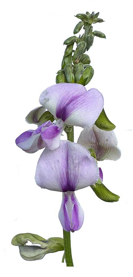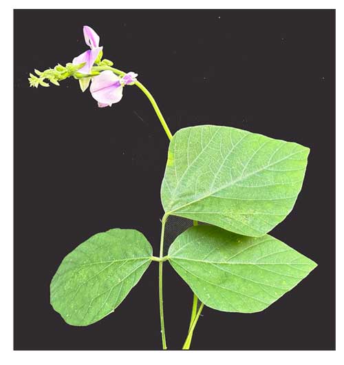 • Deep-rooting perennial herb with climbing or twining, hairy stems. Roots subtuberous. Main stems about 6 mm in diameter, extending 4.5—10 m, rooting at nodes if in contact with moist soil, lateral stems branching from nodes; young shoots densely covered with brown hairs. Leaves large, trifoliolate; stipules triangular to ovate, 4—11 mm x 2—3 mm, pubescent; petiole 3—11 cm long, hairy; stipels lanceolate to setaceous, 3—7 mm long; petiolule 2—5 mm long; top leaflet symmetrical, triangular or ovate, 2—20 cm x 2—16 cm, thin, base broadly cuneate or subrhomboidal and very shallowly lobed, apex acuminate, lateral leaflets oblique, (4—)6—7(—14) cm x (3—)6—7(—12) cm, thinly hairy on upper surface, grayish-green and densely pubescent on lower surface. Inflorescence an axillary, unbranched raceme, 10—46 cm long, pubescent; peduncle about 13 cm long; bracts 2—5 mm long, pubescent; flowers 10—23 mm long, mauve to deep purple, borne in pairs; bracteoles lanceolate, 1—3 mm long; pedicel 2—6 mm long; calyx campanulate, 6 mm long, hairy, upper teeth broad, lateral ones triangular, the lower lanceolate and all terminating in a bristle; standard orbicular, 1—2.5 cm in diameter, spurred, greenish on outside and white on the inner side with a mauve violet central blotch; stamens 10, diadelphous. Fruit a straight or slightly curved, terete or compressed cylindrical pod, 4—12.5 cm x 3—5 mm, thinly clothed with stiff appressed hairs, black when mature, 10—20-seeded. Seed cylindrical to cubic with rounded corners, about 3 mm x 2 mm, brown to brownish-black. (PROSEA) (2)