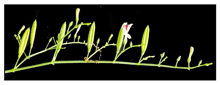 • Growth form: Annual herb with branched growth form up to 0.5 m tall. Foliage: Leaves (1.5-7 cm long, 1-2.5 cm wide) are ovate-lanceolate (intermediate between egg-shaped and lance-shaped), lanceolate or narrowly elliptic (narrow oval). Stems: Stems are hairless and 4-sided. Flowers: Two-lipped, tubular flowers (0.9-1.5 cm long) are white with the lower lip having purple dots. The outer surface of the tube is covered in glandular hairs (hairs with glands at the tip). Flowers are arranged in a secund raceme (a spike-like inflorescence composed of stalked flowers that are all pointing in a single direction). The racemes are arranged in branched clusters near the stem tip known as terminal panicles. Fruit: Dry, dehiscent fruit is known as a capsule (1.5-2 cm long, 0.3-0.4 cm wide). It has a flattened, oval shape. Each capsule contains about 12 wrinkled seeds (2 mm long, 1.5 mm wide). (Flora & Fauna Web)