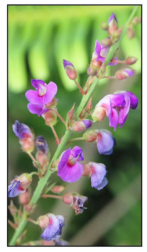 • Winged-Stalk Desmodium is a subshrub, growing up to 1-2 m tall, with erect stems which are almost woody. Branches are triangular in cross section, velvety. Leaves are alternately arranged, and the leaf stalk has prominent wings. Leaves are linear-oblong, ovate or heart-shaped, with a tapering tip. Flowers arise in many-flowered racemes in leaf axils. Flowers are small, shaped like pea flowers, pink to pale violet, with a nearly circular standard petal, notched at tip; wings obovate, eared, clawed; keel arcuate, eared, clawed. Legumes are hairy, 5-8 jointed. (Flowers of India)