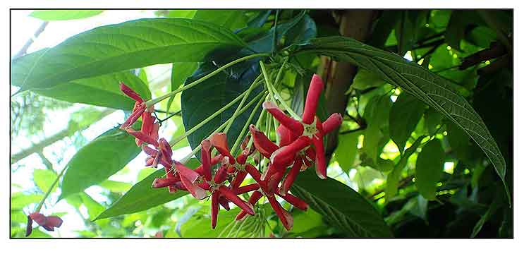 • Growth form: A large climber which can grow up to 5 to 12 m long. Foliage: Leaves are pinnate-compound and alternately arranged along the stems. New leaves are red but turn green when mature. Leaflets are obovate and coriaceous with an acute apex and are very pale green on the underside. Flowers: Pink flowers occur in clusters known as pseudoracemes or pseudopanicales (up to 30 cm long). (Flora & Fauna Web)