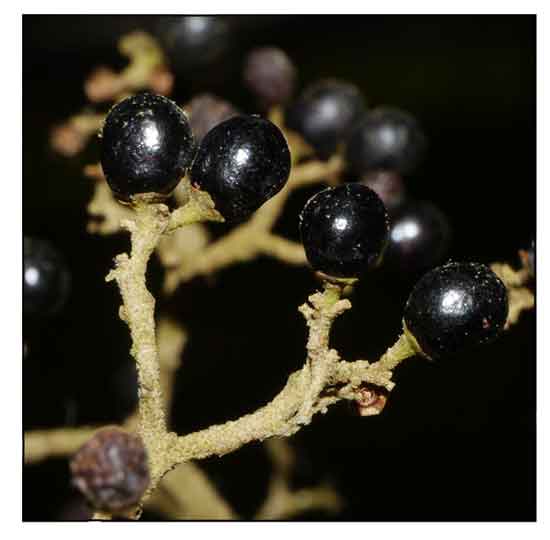 • Trees ca. 8 m tall; branchlets, inflorescences, and petioles densely tomentose, hairs stellate or verticillately branched. Leaf blade elliptic, oblong-elliptic, or ovate, 13-37 X 7-13 cm, leathery, abaxially densely yellow-brown stellate tomentose, adaxially dark green and shiny, base cuneate to rounded, margin entire. Cymes 6-11 cm across; peduncle 4-angled, longer than petioles. Calyx cup-shaped, truncate or nearly so, outside densely gray stellate tomentose. Corolla purple, ca. 3 mm. Stamens much longer than corolla. (Flora of China)