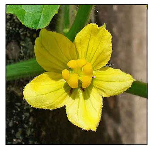 Citrillus colocynthis is an herb with long, prostrate stems covered with stiff hairs. Leaves alternate, triangular, deeply cleft in 3 lobules that subdivide. Petioles long. The color of the leaves is pale green above, whitish or gray and covered with white hairs underneath. Flowers yellow, monœcious, solitary, axillary, with long peduncles. Staminate: receptacle cup-formed, 5 sepals and 5 free, yellow petals; 5 stamens in pairs, one free. Pistillate: the receptacle globose, covering the lower part of the ovary; 3 staminodes take the place of the stamens. Ovary unilocular, uniovulate, with a short style bearing 3 lobules at its apex. Fruit globose, 6–8 centimeters in diameter, smooth, greenish, later yellow with white spots; it is full of a whitish pulp that becomes dry and pithy and that contains the obovate seeds, smooth, flattened, brown, lacking albumen. (2) Each of the three carpels bears six seeds. Each plant produces 15 to 30 fruits. (4)