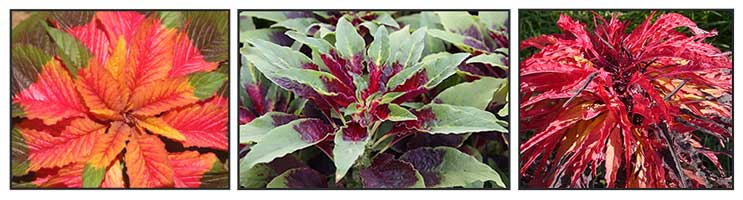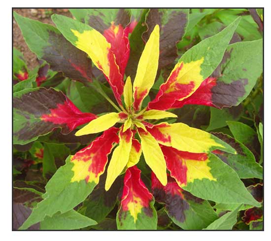 • Plants annual, glabrous. Stems erect, often branched, 0.8-1.5 m. Leaves: petiole 1/2 as long as blade; blade ovate, elliptic, rhombic, or lanceolate, mostly 4-12 to 1.4-6 cm, base tapering, margins entire, usually undulate, apex acuminate and short-mucronate; distal leaf blades green, red, scarlet, maroon, purple, yellow, and cream (unique to A. tricolor) . Inflorescences axillary glomerules. Bracts of pistillate flowers ovate to lanceolate, 5-6 mm. Pistillate flowers: Tepals 3, narrowly ovate to lanceolate, 5-6 mm, apex aristate; style branches spreading; stigmas 2-3. Staminate flowers intermixed with pistillate; tepals 3; stamens 3. Utriclesovoid, 2-2.5 mm, rugose, dehiscence regularly circumscissils. Seeds: black or brownish black, subglobose, 1 mm diameter, shiny. (Flora of North America)