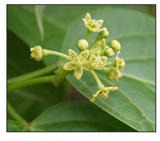 • Climbing herbs, stem glabrous. Leaves 6-10 x 3-5 cm, ovate, apex acute or acuminate, base rounded or subcordate, 5-ribbed, glabrous with a few small black glandular papillae at base, lateral nerves 3 pairs; petiole to 2.5 cm long. Racemes to 2.5 cm long. Flowers 8 mm across, many together; pedicels 1 cm long, slender, pubescent; sepals small, ovate to orbicular, ciliate; corolla greenish-yellow with brown dots, 4 mm long, lobes ovate; gynostegium 2 mm across, outer corona lobes orbicular, emarginate, membranous; inner corona similar to outer. (eFloraofIndia)