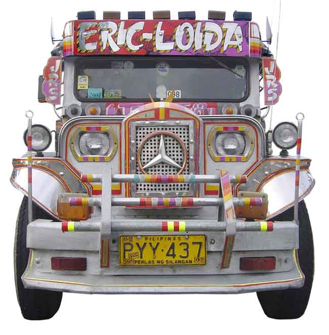| Eric-Loida on the panel board; usually a place that dedicates the jeepney to a family name or a religious quote. Fairly symmeterical application of sticker art and accessories on a a hybrid shell of galvanized and stainless steel. Note the oversized Benz logo. Also, the series of lights atop the panel board. |