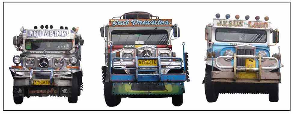 These three jeepneys were parked side-by-side waiting their turns to load passengers, their panel boards rife with religious invocations: IN GOD WE TRUST. GOD PROVIDES. JESUS IS LORD.