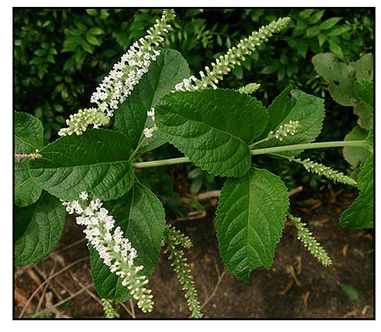 • A shrub or small tree up to 7 m tall; branches terete, densely appressed or woolly stellate-hairy when young. Leaves opposite, simple, narrowly lanceolate to oblong- or ovate-lanceolate, 3—30 cm x 0.5—7 cm, cuneate at base, long-acuminate at apex, margin remotely serrate-dentate to entire, densely hairy beneath, pinnately veined; petiole 2—15 mm long; stipules absent, but 2 opposite petioles connected by a stipular line. Inflorescence a terminal and/or axillary spike-like thyrse up to 25 cm long, composed of 1—3-flowered cymes in the axils of linear bracts, densely tomentose. Flowers bisexual, 4-merous, occasionally a few 5-merous, sessile or subsessile; calyx campanulate, 1.5—4.5 mm long, with triangular-oblong lobes; corolla 3—6 mm long, lobes distinctly shorter than tube, outside stellate-hairy, white, sometimes pale violet or greenish; stamens inserted on the corolla tube, filaments extremely short; ovary superior, 2-celled, style short, stigma club-shaped. Fruit an ovoid or oblong, flattened capsule 3—5 mm long, 2-valved, glabrous, brown, many-seeded. Seeds ellipsoid, small, with a short wing at both sides, endosperm fleshy. (30)
