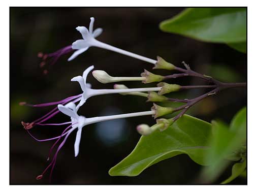 • Growth form: It is an evergreen erect bush that grows up to about 3 m tall, or a climber up to 13 m long. Foliate: Stalked leaves have membranous leaf blades that are oval or narrowly lance-shaped, not covered with hair when mature, and 3.8–8.8 by 1.8–4.3 cm, with inconspicuous veins. Flowers: Flowers grow in groups of 3–7 on the end of branches (axils). Its petals are white or tinged purple, and fragrant. Fruit: Fruit is a drupe, drop-shaped, bright green turning black or brown, and 0.8 cm in diameter. (Flora & Fauna Web)
