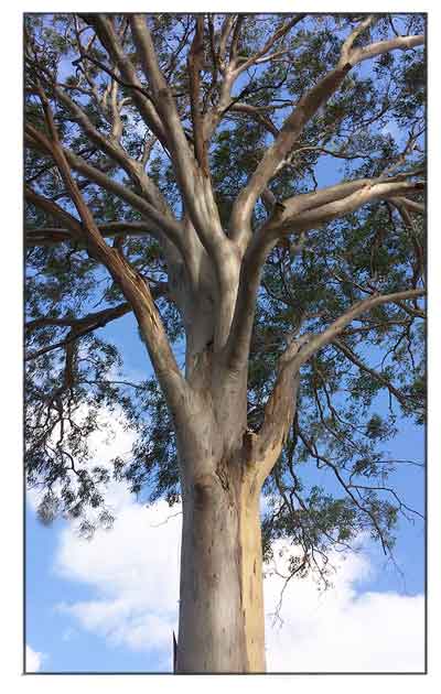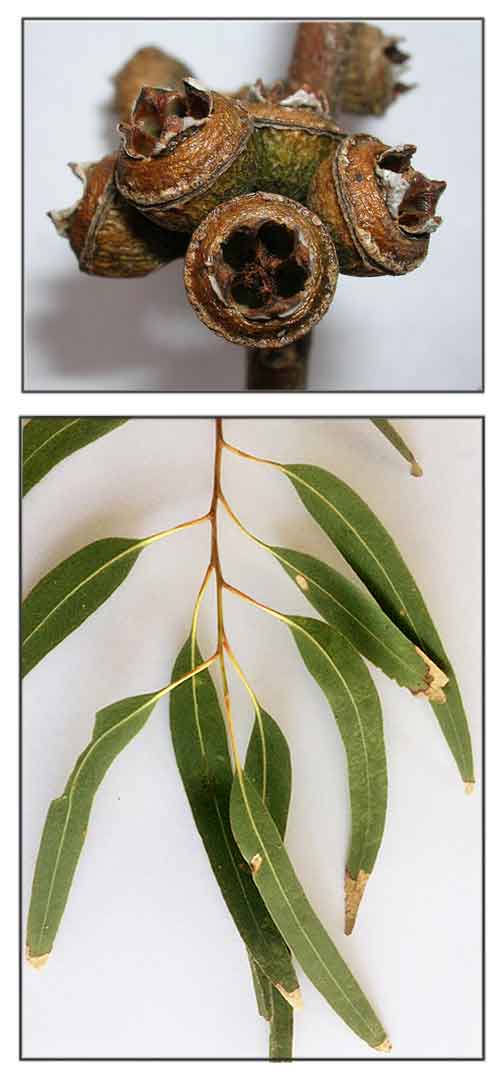 • Eucalyptus tereticornis is a tree that typically grows to a height of 20–50 m (66–164 ft) and forms a lignotuber lignotuber. Trunk is straight, usually unbranched for more than half of the total height of the tree and has a girth of up to 2 m (6 ft 7 in) dbh. Thereafter, limbs are unusually steeply inclined for a Eucalyptus species. The bark is shed in irregular sheets, resulting in a smooth trunk surface colored in patches of white, gray and blue, corresponding to areas that shed their bark at different times. Young plants and coppice regrowth have dull bluish green, egg-shaped leaves that are 60–130 mm (2.4–5.1 in) long and 30–80 mm (1.2–3.1 in) wide. Adult leaves are the same shade of green on both sides, lance-shaped to curved, 80–220 mm (3.1–8.7 in) long and 10–35 mm (0.39–1.38 in) wide, tapering at the base to a petiole 13–30 mm (0.51–1.18 in) long. Flower buds are arranged in leaf axils in groups of seven, nine or eleven on an unbranched peduncle 7–25 mm (0.28–0.98 in) long, the individual buds on pedicels 2–6 mm (0.079–0.236 in) long. Mature buds are an elongated oval shape, 9–16 mm (0.35–0.63 in) long and 3–6 mm (0.12–0.24 in) wide with a conical to horn-shaped operculum that is much longer than the floral cup. Flowering has been recorded in most months and the flowers are white. Fruit is a woody, hemispherical capsule 2–6 mm (0.079–0.236 in) long and 4–8 mm (0.16–0.31 in) wide with the valves prominently protruding. (23)