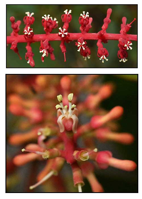 • Glabrous except for the inflorescence and flowers hairy when young, soon glabrescent except sometimes for the inflorescence axis and fruit remaining shortly pale brown-tomentose and the ovary remaining grey-white tomentose. Leaves opposite or subopposite; lamina ovate, 5–18 by 1.5–6(–8) cm, cuneate to truncate at the base to a petiole 5–20 mm long, acuminate and acute at the apex, thin, lustrous or dull on either side; venation pinnate with the midrib and main laterals distinct on both sides. Inflorescences at the nodes, a many-flowered raceme; axis (50–)100–300 mm long; pedicels (0.3–)1–2 mm long, often verticillately clustered; bracts ovate or triangular, sometimes with a dorsal transverse fold, obtuse or acute, 0.7–1.5 mm long. Ovary campanulate, 1, 5–3 mm long; calyx limb entire, spreading, 0.3–0.7 mm long. Corolla in mature bud 5–merous, (3–)4–9 mm long, usually strongly keeled in the lower part, narrowed to a slender neck, clavate and obtuse or rounded at the apex, mostly bright red, rarely almost white. Anther 1–2.5 mm long, obtuse, about equal to the free part of the filament. Style (2–)3–5(–6) mm long, reaching to the base of the anthers, angular in the lower 1–3 mm below a distinct constriction, more slender above; stigma capitate, hardly wider than the style apex. Distribution