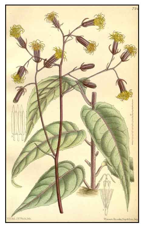 Herbs, scandent. Stems procumbent, brownish or purple striate, glabrous or pubescent when young, branched. Leaf petiole 5-15 mm, glabrous; blade abaxially purplish, adaxially green, ovate, ovate-oblong, or elliptic, 3-8 × 1.5-3.5 cm, both surfaces glabrous, rarely sparsely pubescent, lateral veins 5-7-paired, curved, veinlets inconspicuous, base rounded-obtuse or cuneately attenuate into petiole, margin entire or repand-dentate, apex acute or acuminate. Upper stem leaves and leaves on synflorescence branches reduced, lanceolate or linear-lanceolate, sessile or subsessile. Capitula 3-5 in each corymb, in terminal or axillary corymbs; peduncles long, slender, often with 1-3 linear bracts, sparsely shortly pubescent or glabrous. Involucres campanulate or funnelform, 15-17 × 5-10 mm; bracteoles at base 5 or 6, linear; phyllaries (9 or)11-13, becoming purplish, oblong-lanceolate, 15-17 × ca. 1.5 mm, glabrous, 1-3-veined, margin narrowly scarious, apically acuminate. Florets 20-30; corolla orange, 12-15 mm, with slender 8-10 mm tube and dilated limb; lobes ovate-lanceolate, apically acute. Anthers obtuse at base, appendages triangular. Style branch tips conical, papillose. (Flora of China)