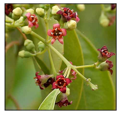 Santalum album is a small evergreen tree that grows to 4 m in Australia, but in India it is much larger and can grow to a height of 20 m; girth of up to 2.4 m, with slender drooping branchlets. Bark is tight, dark brown, reddish, dark grey or nearly black, smooth in young trees, rough with deep vertical cracks in older trees, red inside. Leaves thin, usually opposite, ovate or ovate elliptical, 3-8 x 3-5 cm, glabrous and shining green above, glaucous and slightly paler beneath; tip rounded or pointed; stalk grooved, 5-15 cm long; venation noticeably reticulate. Flowers purplish-brown, small, straw colored, reddish, green or violet, about 4-6 mm long, up to 6 in small terminal or axillary clusters, unscented in axillary or terminal, paniculate cymes. Fruit a globose, fleshy drupe; red, purple to black when ripe, about 1 cm in diameter, with hard ribbed endocarp and crowned with a scar, almost stalkless, smooth, single seeded. (3)