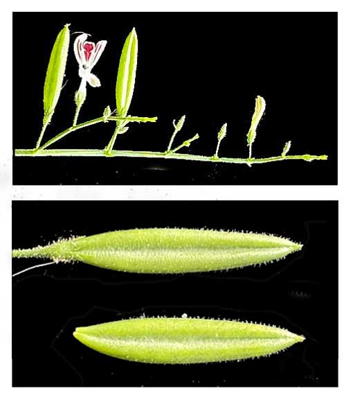 • Growth form: Annual herb with branched growth form up to 0.5 m tall. Foliage: Leaves (1.5-7 cm long, 1-2.5 cm wide) are ovate-lanceolate (intermediate between egg-shaped and lance-shaped), lanceolate or narrowly elliptic (narrow oval). Stems: Stems are hairless and 4-sided. Flowers: Two-lipped, tubular flowers (0.9-1.5 cm long) are white with the lower lip having purple dots. The outer surface of the tube is covered in glandular hairs (hairs with glands at the tip). Flowers are arranged in a secund raceme (a spike-like inflorescence composed of stalked flowers that are all pointing in a single direction). The racemes are arranged in branched clusters near the stem tip known as terminal panicles. Fruit: Dry, dehiscent fruit is known as a capsule (1.5-2 cm long, 0.3-0.4 cm wide). It has a flattened, oval shape. Each capsule contains about 12 wrinkled seeds (2 mm long, 1.5 mm wide). (Flora & Fauna Web)