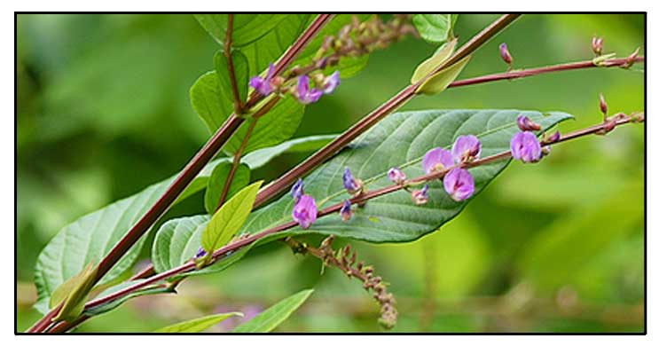 • Winged-Stalk Desmodium is a subshrub, growing up to 1-2 m tall, with erect stems which are almost woody. Branches are triangular in cross section, velvety. Leaves are alternately arranged, and the leaf stalk has prominent wings. Leaves are linear-oblong, ovate or heart-shaped, with a tapering tip. Flowers arise in many-flowered racemes in leaf axils. Flowers are small, shaped like pea flowers, pink to pale violet, with a nearly circular standard petal, notched at tip; wings obovate, eared, clawed; keel arcuate, eared, clawed. Legumes are hairy, 5-8 jointed. (Flowers of India)