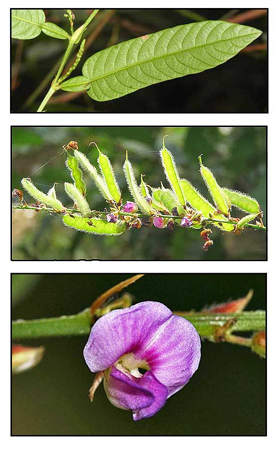 • A subshrub up to 3 m tall, branchlets glabrescent; leaflet narrowly elliptical to obovate, 3.5-20 cm × 1-6 cm, usually more than 3 times longer than broad, apex acute, upper surface finely pubescent, lower surface variably pubescent, petiole 1-5 cm long, prominently winged, stipules 8-25 mm × 4-7 mm; calyx 4-5 mm long, hairy, corolla 5-6 mm long, pink, red or blue; pod distinctly stalked, 5-8-jointed, densely clothed with yellowish or whitish soft hairs both on the sutures and the lateral surface, not reticulate-veined, articles mostly 2.5-3.5 mm × 5-6 mm. In Malesia only subsp. triquetrum is present. (3)