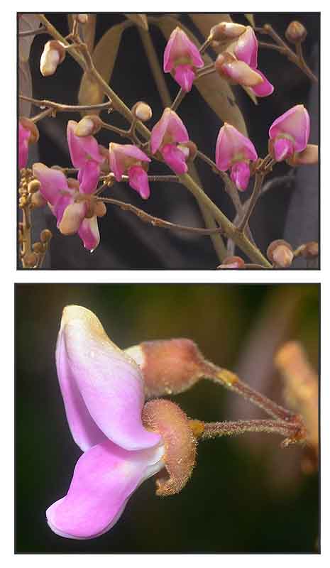 • Growth form: A large climber which can grow up to 5 to 12 m long. Foliage: Leaves are pinnate-compound and alternately arranged along the stems. New leaves are red but turn green when mature. Leaflets are obovate and coriaceous with an acute apex and are very pale green on the underside. Flowers: Pink flowers occur in clusters known as pseudoracemes or pseudopanicales (up to 30 cm long). (Flora & Fauna Web)